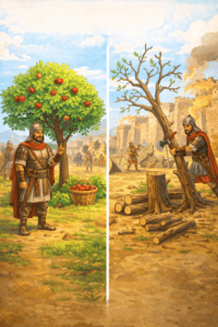 10. Вт.20:19 Если долго держишь город в осаде, не уничтожай деревья, от которых можно есть. Не разоряй землю вокруг — дерево не враг и не может убежать от тебя. Только те деревья, которые не дают пищи, можешь рубить и использовать для укреплений против города, пока не возьмёшь его.